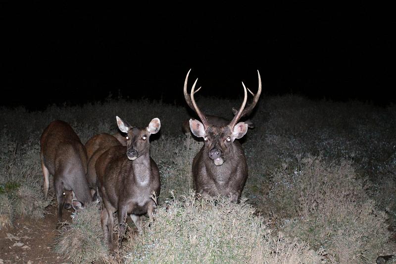 夜半傳來動物撕咬箭竹聲,原來,這些水鹿聞「香」而來,將附近尿過的箭竹啃得喀喳作響,清晨還有兩隻留念不肯離去呢!