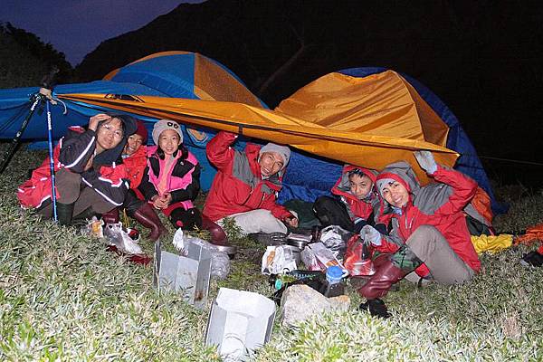 小妞很快就睡覺了,維文今日幫忙炊煮,應該記個嘉獎,其餘的人則在緊急帳下大吃一頓,有飯有麵,有茶有湯,補足了一日的辛勞;星空滿天,一彎眉月從東方緩昇,明日行程略為和緩,大人、小孩可以開心暢談,不用擔心吵到別人,洵為樂事也。